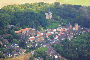 Die Erhebung, der Liedberg, bot neben den vermuteten römischen Vorgängern dem Herrensitz Liedberg eine topographisch günstige Lage für eine Burgbefestigung. Diese Burg des 12. Jahrhunderts wurde später mit einer Burgsiedlung erweitert. Zahlreiche Herrensitze vor allem entlang des Kommerbaches (z.B. Haus Horst, Burg Steinhausen, Haus Rädt, Haus Schlicken, Haus Fürth, Haus Neuenhoven) sind Zeugen der mittelalterlichen Siedlungsgeschichte in diesem Raum. Besonders hervorzuheben ist hier Schloss Dyck.